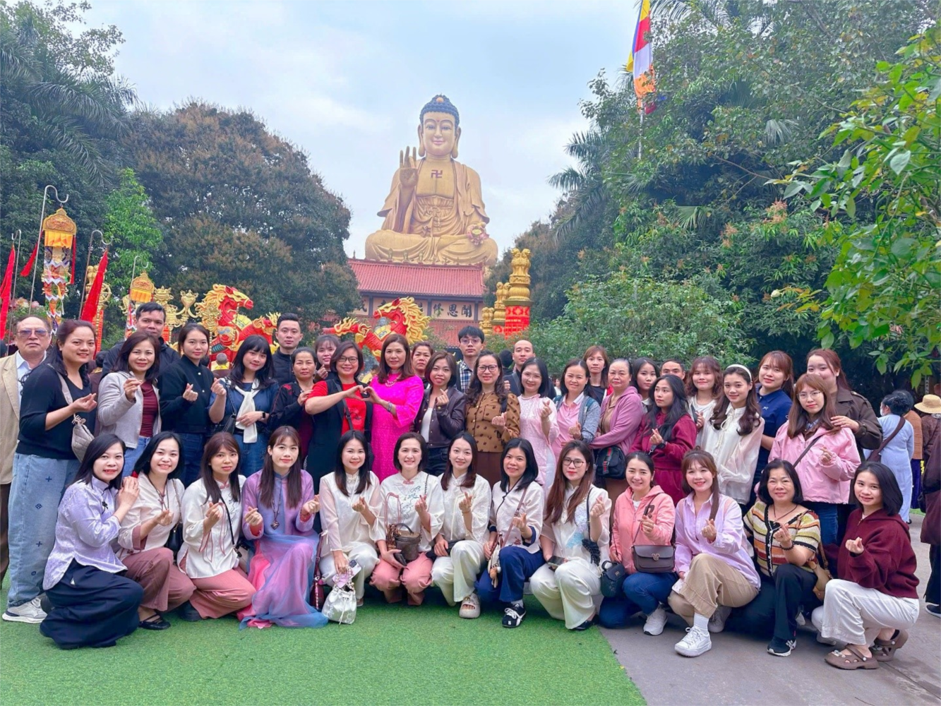 Điểm dừng chân đầu tiên là Chùa Khai Nguyên (Sơn Tây). Giữa không gian thanh tịnh, các thầy cô đã cùng chiêm bái đại tượng Phật A Di Đà vì hòa bình thế giới. Hình ảnh những tà áo dài thướt tha của các cô giáo hòa cùng sắc xuân nơi cửa Phật đã tạo nên một bức tranh vô cùng nên thơ và tôn nghiêm.